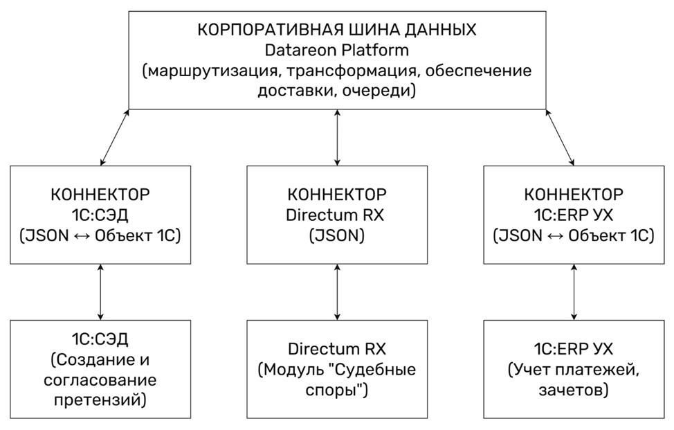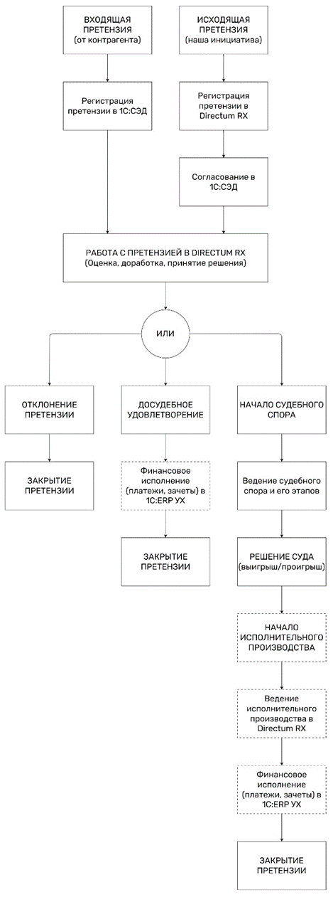 Организационной сложностью оказалась интеграция с 1С: ERP.УХ – основной учетной системой Компании. Необходимо было сначала договориться, как пользователям работать в системах 1С и Directum RX, удовлетворяя требования процесса «Судебные споры», затем объединить программы с помощью интеграции.