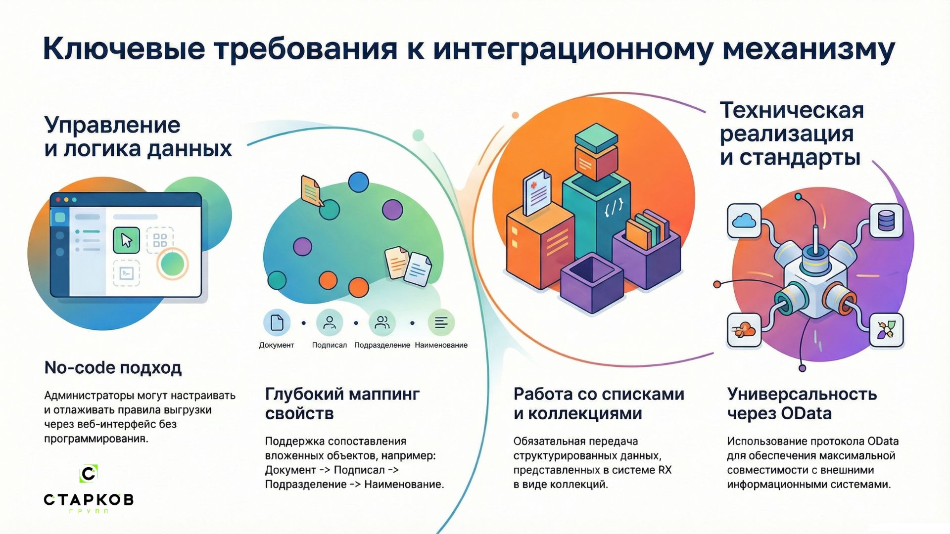Разработанное компанией “СТАРКОВ Групп” решение эффективно закрывает типовую, но ресурсоемкую задачу — организацию экспорта данных. Оно переносит фокус с написания кода на конфигурирование бизнес-логики, что значительно ускоряет процессы интеграции и делает их более управляемыми.