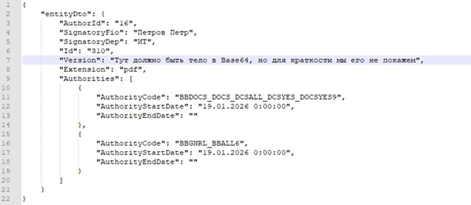 Отправка документа в учетную систему производится по действию из карточки документа. В нашем примере имеем выходной JSON: