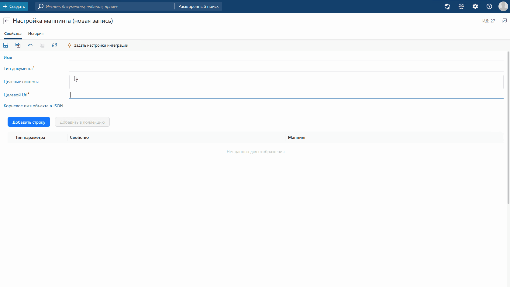 В справочнике «Маппинг интеграции» создаём новую настройку. Здесь мы связываем RX и внешний мир: