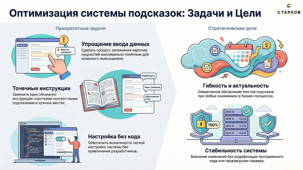 Подсказки можно оперативно включать, отключать или редактировать через справочник. Это упрощает сопровождение и повышает удобство работы пользователей.