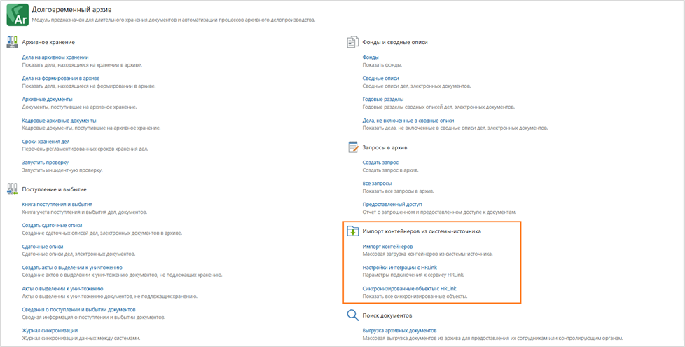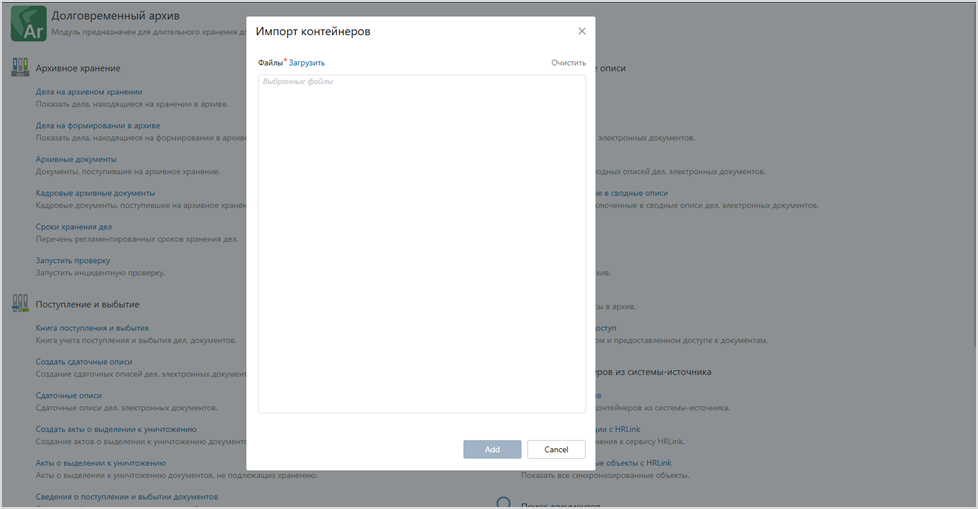 1. Загрузку zip-контейнеров в Directum RX по аналогии с массовым созданием приложений. Действие расположили в модуле Долговременный архив, по нажатию открывается диалоговое окно, в котором пользователь может загрузить zip-контейнеры в систему.