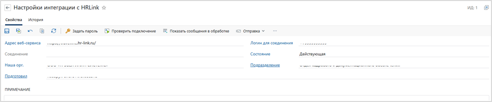 2. Справочник настройки подключения к HRLink, так как для корректного создания документа в системе нам не хватало данных в загруженном zip-контейнере. В карточке справочника указывается логин и пароль к системной учетной записи на стороне HRLink с соответствующими правами доступа на документы. Дополнительно в данном справочнике можно просмотреть очередь сообщений, выполняемых Системой: это полезно, если за один раз было импортировано большое количество zip-контейнеров. В этой же очереди можно сразу же посмотреть ошибки, которые могут возникнуть при импорте.