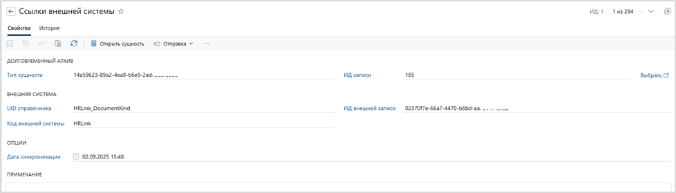 3. Справочник для синхронизации сущностей между HRLink и Directum RX. В справочнике созданы сущности, являющимися синхронизированными объектами. К примеру в данном справочнике созданы сущности для определения вида документа из загруженного контейнера. В случае, если в контейнере в файле json нашлось совпадение по GUID внешней записи, то карточки документов по данному контейнеру создаются с соответствующим видом документа.