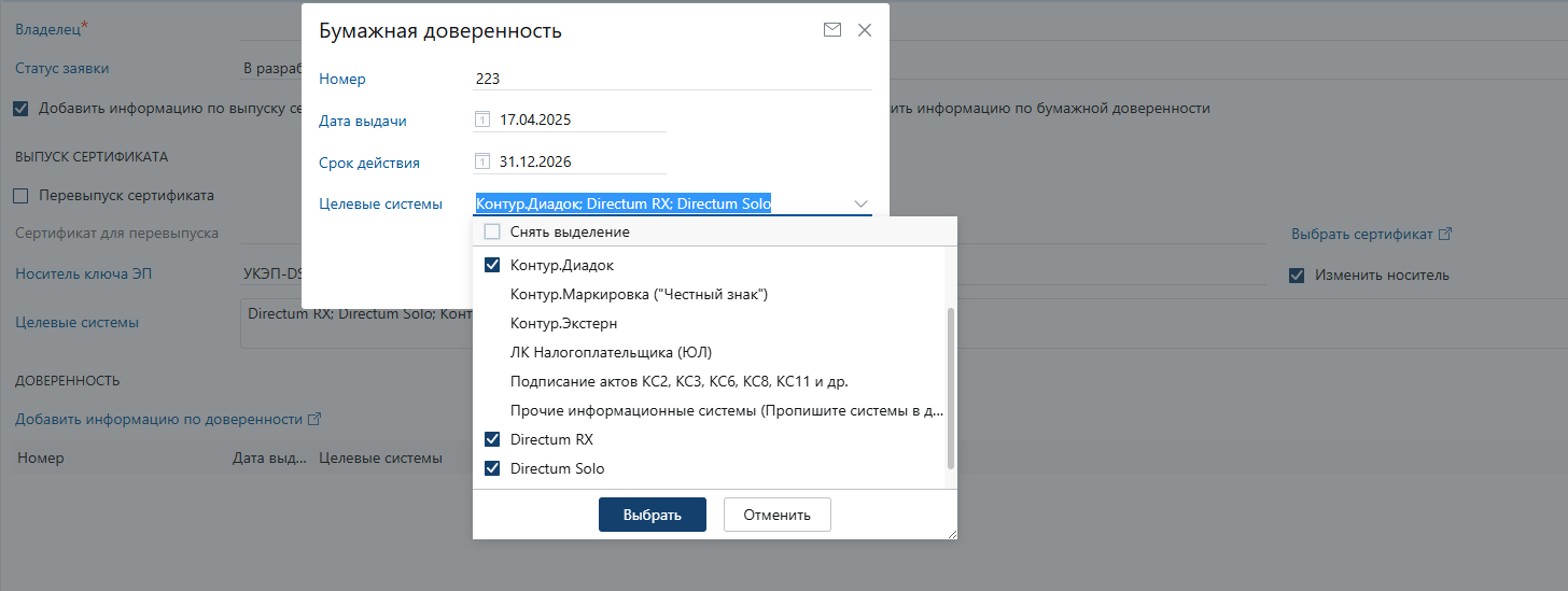 Для всех компаний выпуск сертификатов централизован через КЦР. Процесс инициируется сотрудником. Он подает электронную заявку на имя директора по внутреннему контролю и экономической безопасности. В письмо прямо из системы подтягиваются необходимые сведения: ФИО, номер телефона. Пользователи выбирают, каким информационным системам нужен будет сертификат. Исходя из этого, вычисляется, какой тип сертификата необходим. Если выбрать Directum RX, Directum Solo, Диадок или Контур.Экстерн, то автоматически выставляется УКЭП-DSS — он указывается по умолчанию.