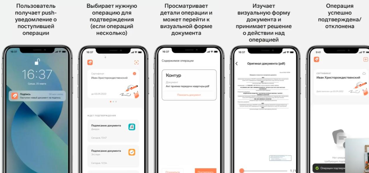 Для нивелирования рисков, связанных с конфиденциальностью данных (в частности, опасений утечки информации), реализован следующий защищенный механизм: на внешний сервис передается исключительно хэш-сумма документа, сам файл не покидает периметр корпоративной системы. Для подтверждения действия необходимо авторизоваться через пуш-уведомление на смартфоне. Совокупное время выполнения операции не превышает 10 секунд.