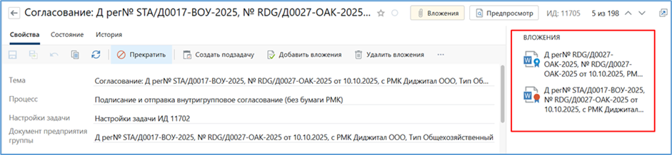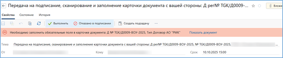 После подписания договора ответственный со стороны “Предприятия 2” получает задание дозаполнить внутренние поля в карточке документа. Это завершающий шаг, после которого договор становится полностью готовым к использованию в рамках локальных процессов предприятия.