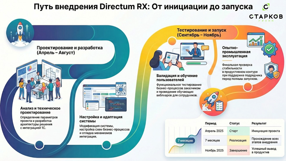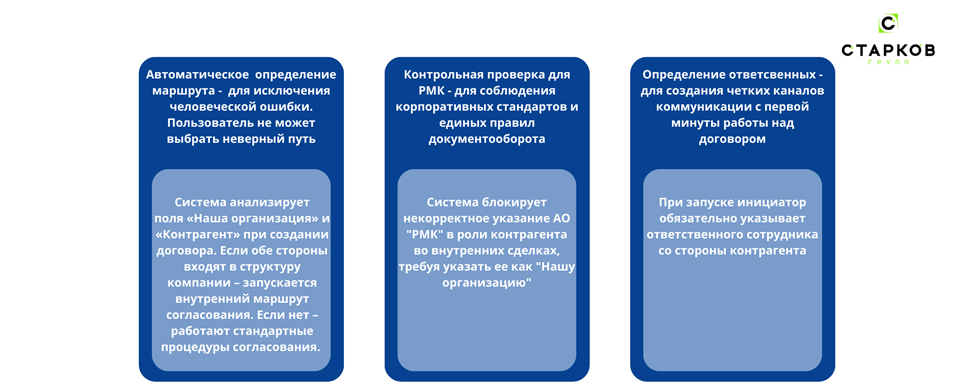 Будучи генеральным партнёром платформы Directum, “СТАРКОВ Групп” специализируется на внедрении и сопровождении систем электронного документооборота, адаптированных под специфику вертикально интегрированных производственных структур. Компания обладает уникальным опытом автоматизации договорной, юридической и корпоративной работы в условиях масштабных холдингов с десятками дочерних предприятий, распределённой географией и сложными внутренними взаимодействиями.