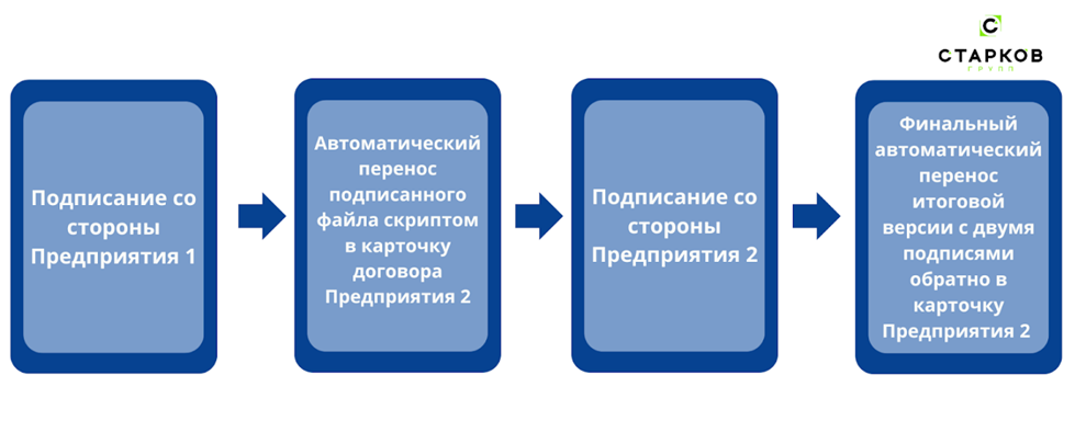 Согласованные и подписанные данные по договору автоматически передаются в “1С” обоих предприятий, гарантируя актуальность информации для бухгалтерского и управленческого учёта.
