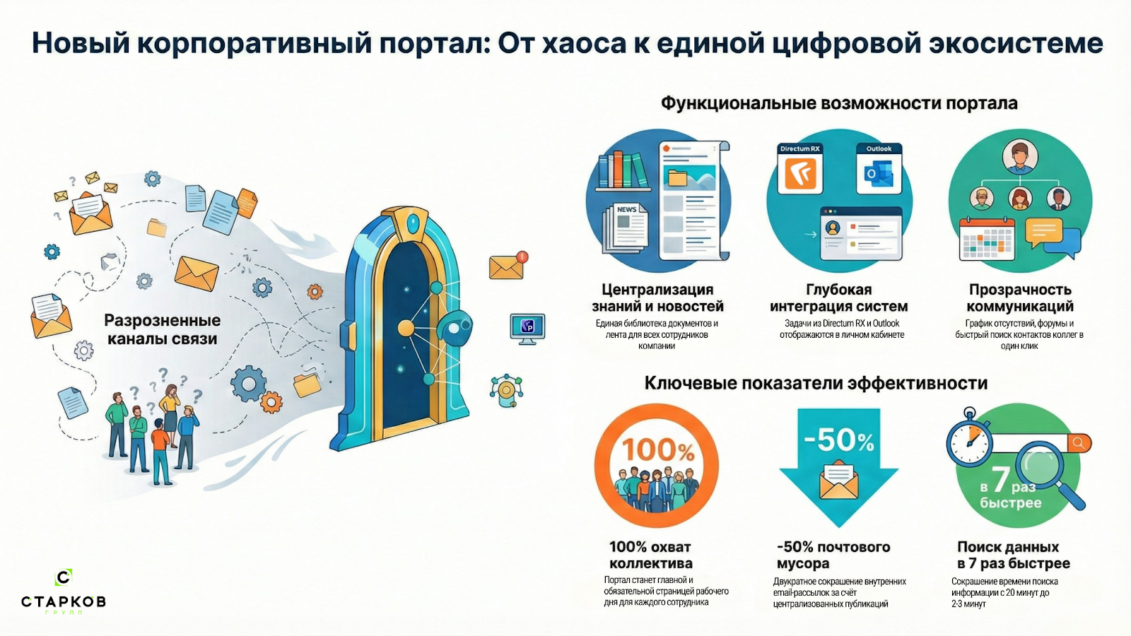 К середине 2025 года в “СТАРКОВ Групп” работало уже больше 70 сотрудников. Офисы в Екатеринбурге, Ярославле, Волгограде, Вологде. Команды распределённые, коммуникации - в основном в чатах и почте. И чем больше мы росли, тем острее чувствовали: нам не хватает единого пространства.