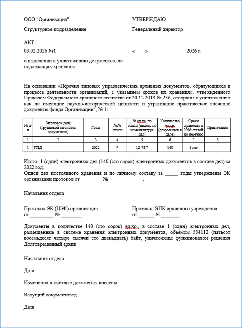 Сроки хранения документов система контролирует автоматически. По документам с истекшим сроком хранения проводится экспертиза ценности и по решению экспертной комиссии документы уничтожаются с утверждением Акта о выделении к уничтожению.