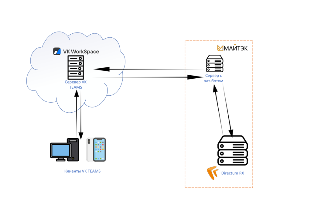 Так как сотрудники значительную часть времени проводят в VK Teams, было принято решение реализовать собственный чат-бот, интегрированный с Directum RX.