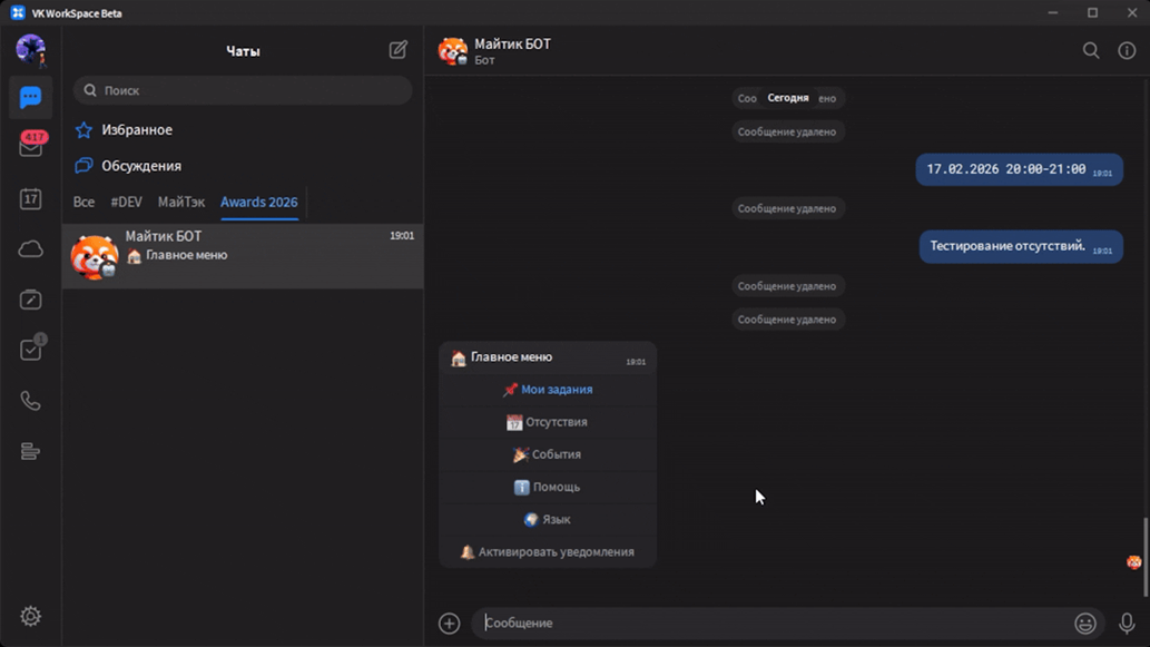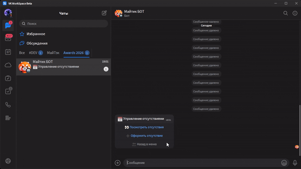 При необходимости оформления отсутствия пользователь чат-бота может оформить его внутри диалога с ботом.