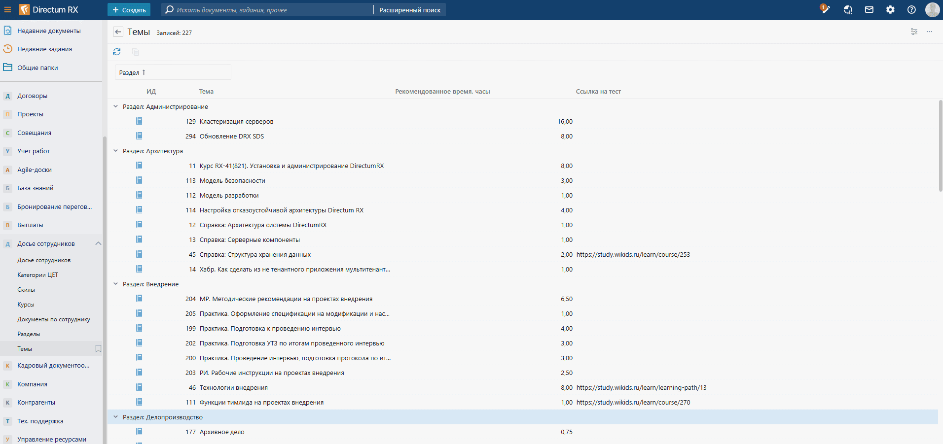 Важно, что у этого контента есть свои авторы. Наполнением базы занимаются штатные преподаватели Центра экспертизы — мы называем их Экспертами. Именно они отвечают за актуальность методичек, стандартов и регламентов, превращая свой опыт в структурированный учебный материал. Что важно: каждая тема содержит не просто ссылку на документ. Мы указали плановые трудозатраты (чтобы сотрудник понимал, сколько времени займет изучение), способ контроля (тест, зачет, экзамен) и привязали актуальные материалы.