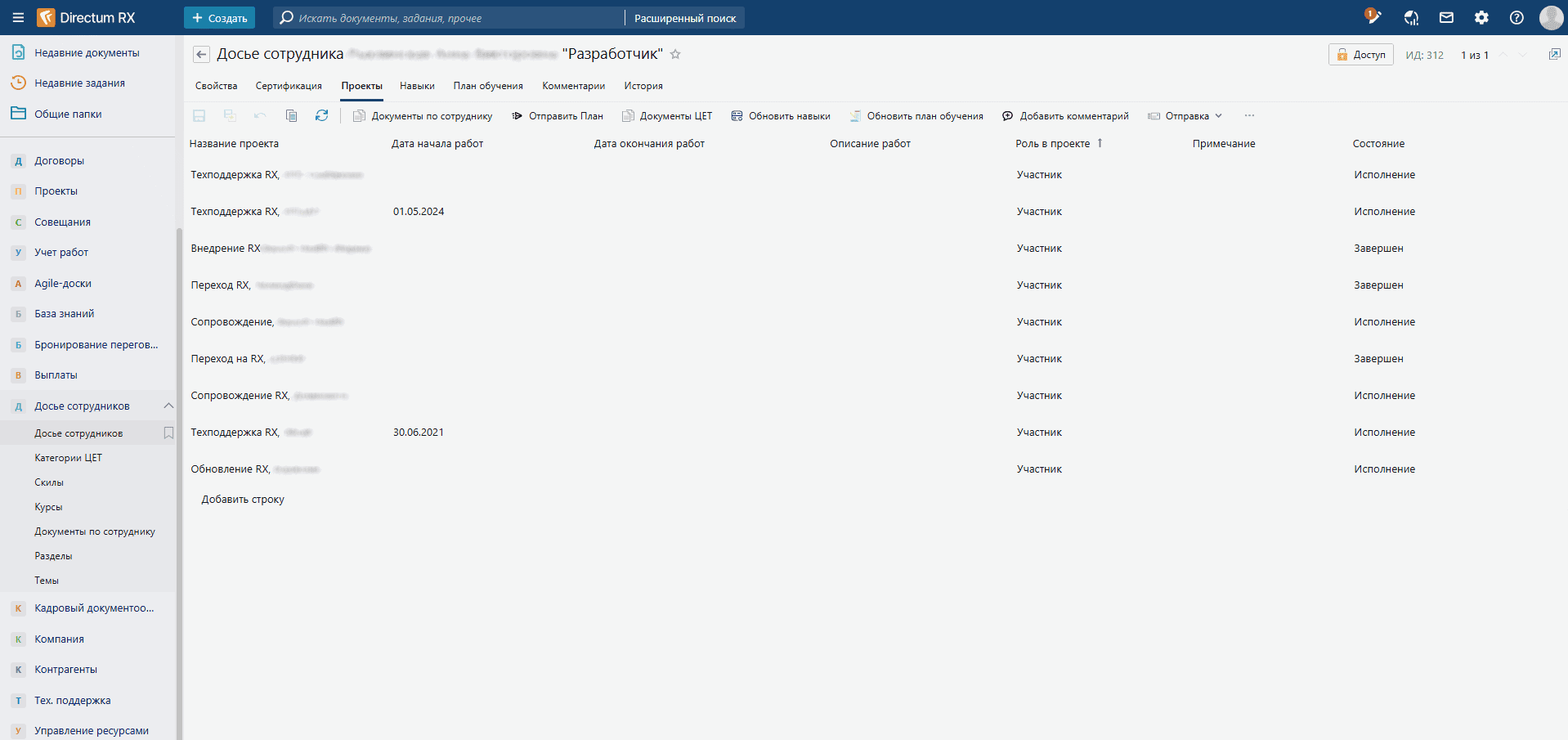 Учет проектной деятельности. Как только сотрудника добавляют в участники проекта в Directum, его досье автоматически пополняется записью об этом проекте. Со временем это превращается в портфолио: видно, в каких проектах участвовал человек, какие задачи решал, какой опыт накопил.
