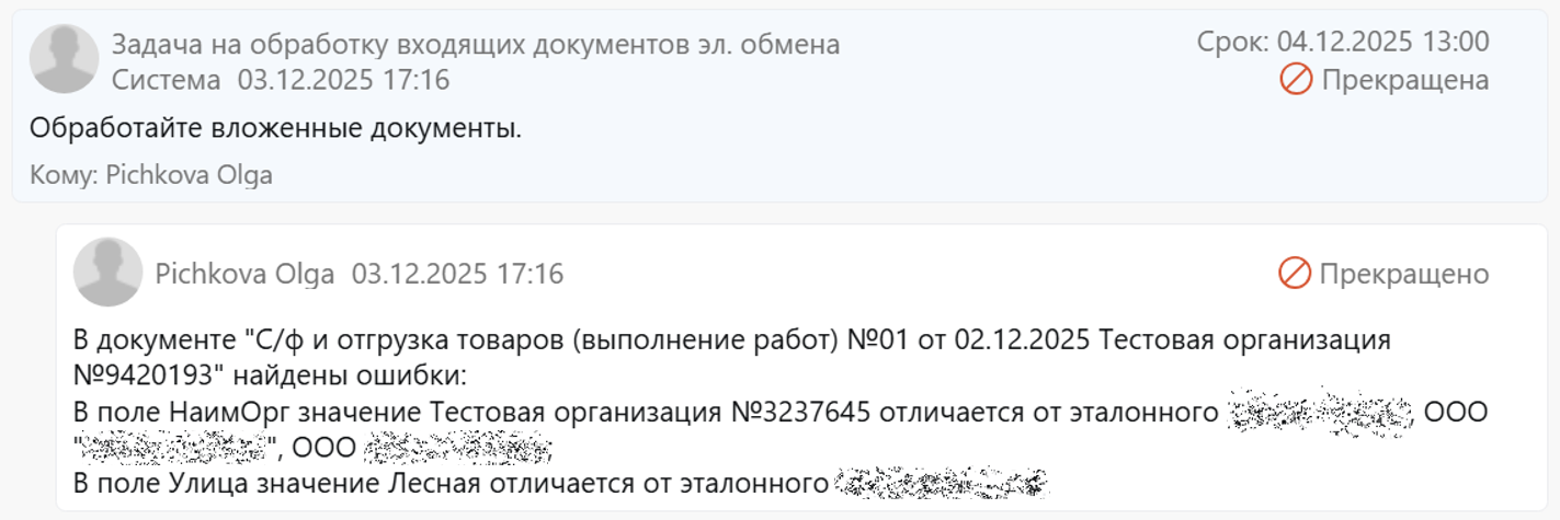 Сотрудники группы закупки получают в работу задание на проверку соответствия документов. В текст задания при помощи шаблонов подстановки встраивается результат обработки реквизитов настроенных видов документов автоматизированным блоком Проверки значений заголовков в формализованных документах на предмет соответствия эталонным значениям.