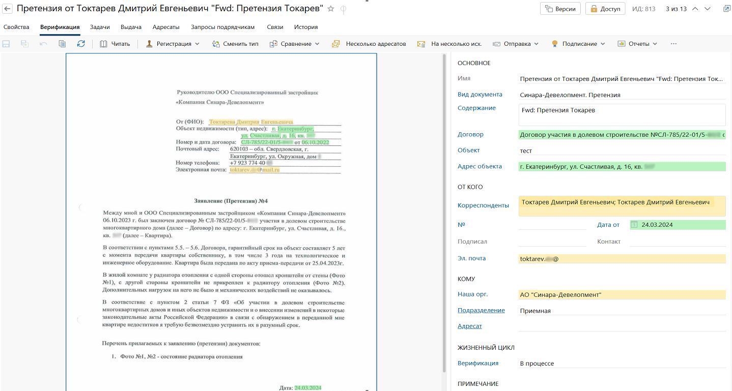 Строительная компания получает претензии от клиентов, требующие регистрации, анализа, взаимодействия с подрядчиками и подготовки официальных ответов заявителям. При ручной обработке таких обращений возникали сложности с контролем сроков, полнотой обработки и фиксацией переписки.