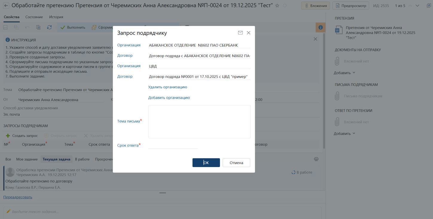 Ответственный исполнитель формирует запросы подрядчикам в карточке претензии. На основании этих данных автоматически создаются исходящие письма подрядчикам и связываются с претензией.