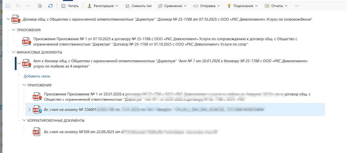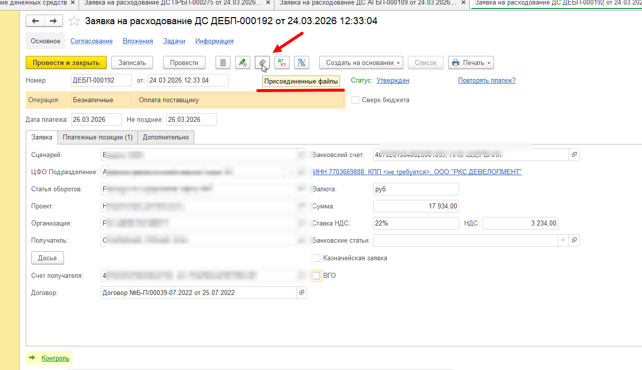 Настройка взаимосвязи с Directum RX путем добавления ссылок в раздел "Вложения" в заявке на оплату: