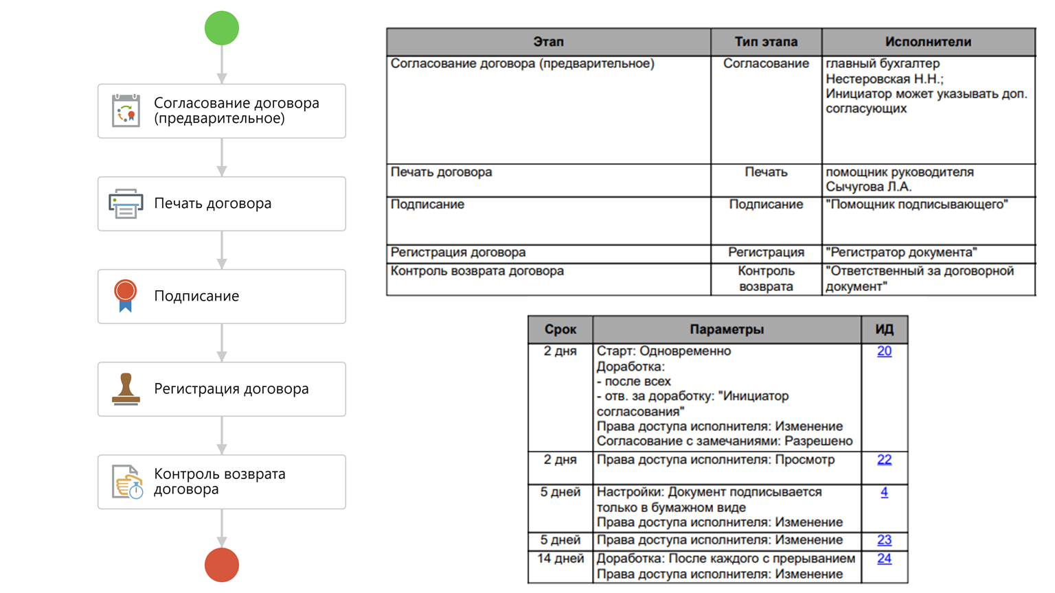 Процесс затронул всех инициаторов договоров (руководители направлений, бухгалтеры, специалисты, организующие закупки, отдел продаж), согласующих лиц и помощника руководителя.
