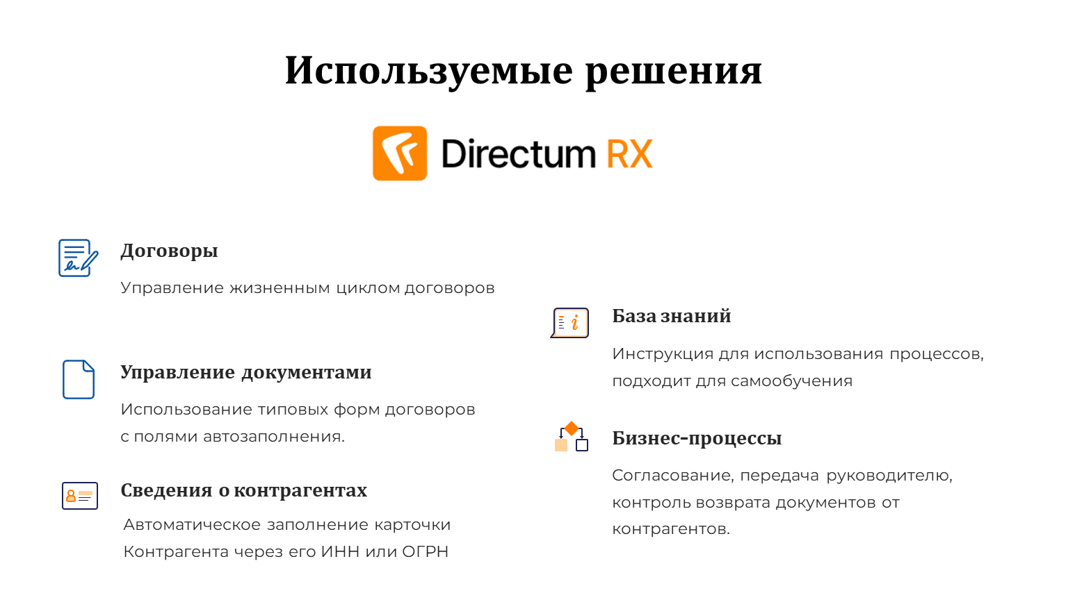 Мы направили проект на полную цифровую трансформацию жизненного цикла договора: от создания карточки контрагента и проекта документа до контроля возврата подписанного экземпляра. Ушли от бумажных служебных записок, ручных журналов регистрации и физической передачи бумаг «из рук в руки» к сквозному электронному процессу в Directum RX.