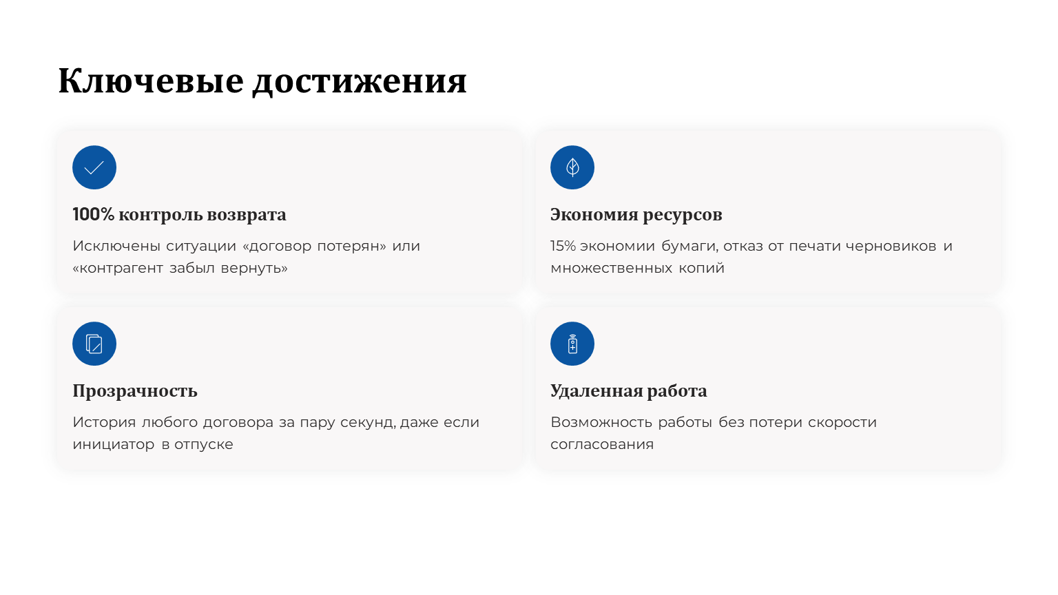 Помощник руководителя после внедрения процесса оказалась разгружена от функции «курьерской службы». Количество посещений приемной руководителя одного сотрудника с одним документом сократилось с 5 до 1. Теперь инициатор приходит только один раз – чтобы забрать уже подписанный руководителем договор.