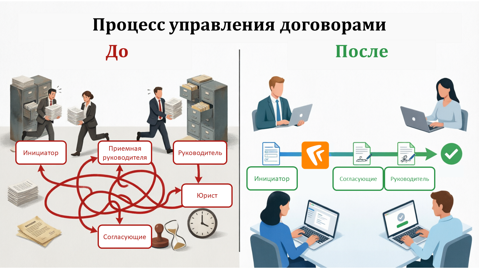 Ранее цикл работы над одним договором занимал до 10 дней из-за логистики между кабинетов и простоев по причине того, что сотрудник в командировке или на больничном. Сейчас норматив — 3 дня, причем инициатор может влиять на сроки. А по практике – один договор теперь разрабатывается, согласовывается и передаётся руководителю в течение 1 рабочего дня.