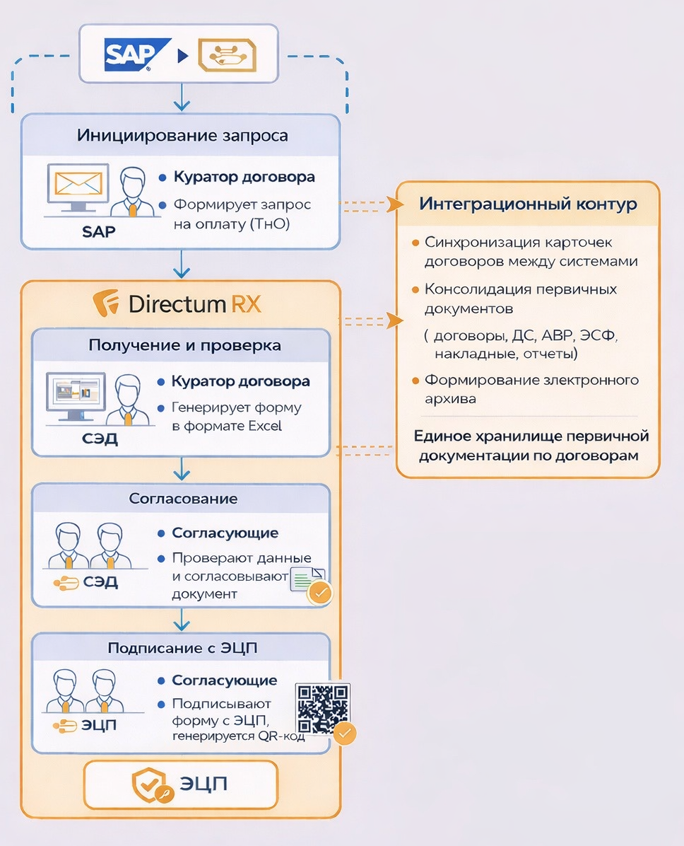 Решение представляет собой автоматизированную интеграцию между системой SAP и СЭД Directum RX, предназначенную для оптимизации процесса формирования, согласования и подписания требований на оплату по договорам.