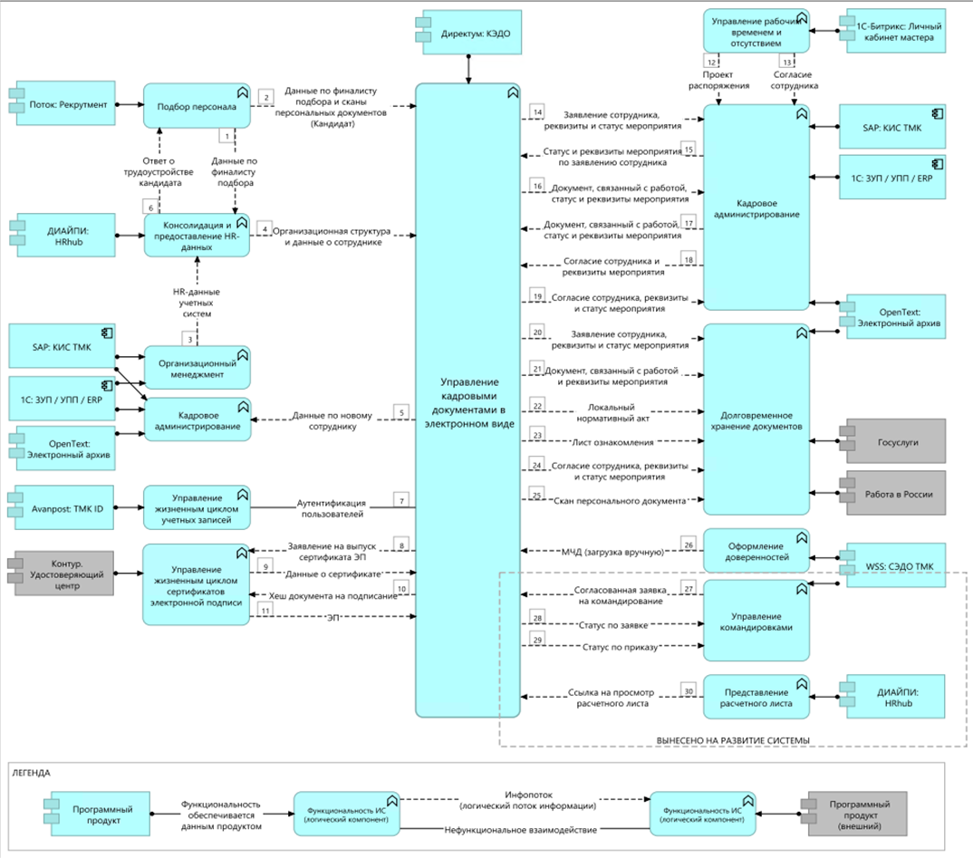 Систему связали с программами, которые уже используются в компании: 1С, SAP, OpenText, Avanpost, ATS Potok, 1С-Битрикс. За счёт этого кадровые процессы не живут отдельно, а проходят сквозь весь ИТ‑ландшафт без ручных переносов данных.