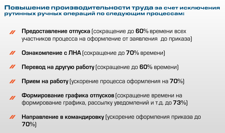 - Кадровые специалисты смогут сосредоточиться на более важных задачах, не привлекая дополнительные ресурсы для соблюдения жёстких сроков