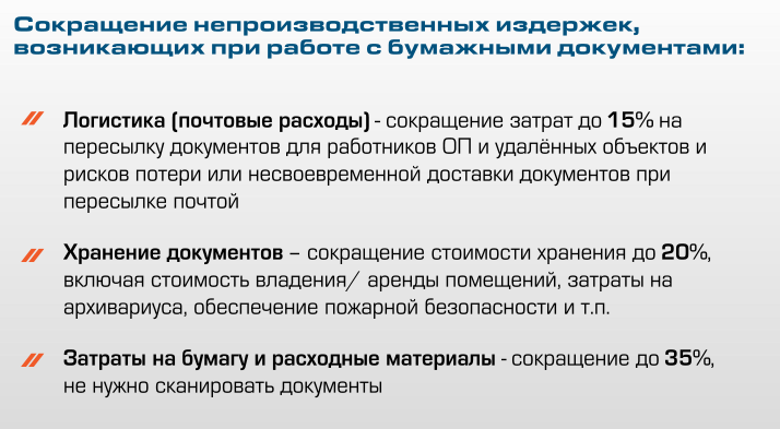 - снижение рисков потери документов, в том числе из-за рисков производственной безопасности (пожары, подтопления, несчастные случаи на производстве)