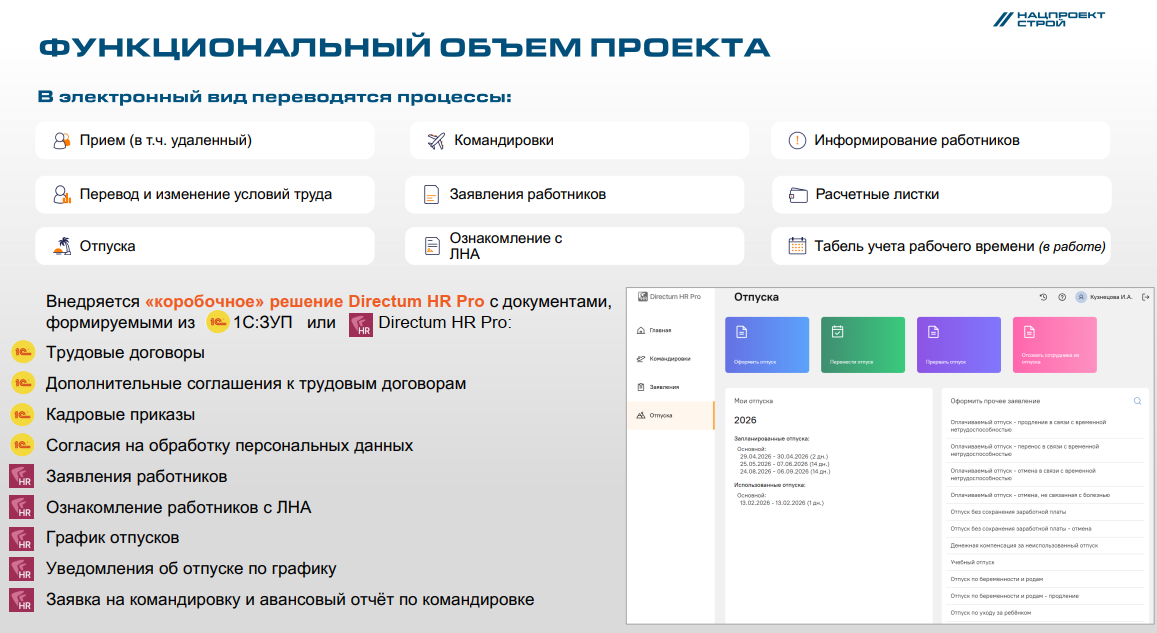 Эксперт Шаблона КЭДО отвечает за единый стандартизированный каркас корпоративной системы кадрового электронного документооборота ГК «Нацпроектстрой» на базе программного продукта Directum HR Pro (далее – Шаблон КЭДО), который тиражируется на все компании группы.