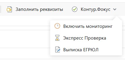 репутации контрагентов: компании важно в автоматическом режиме оперативно получать сведения о негативном статусе контрагента или переходе в него. Важно, чтобы принятие решения было основано на фактах. Для этого в рамках проекта был обогащен интеграционный механизм с сервисом «Контур.Фокус»:
