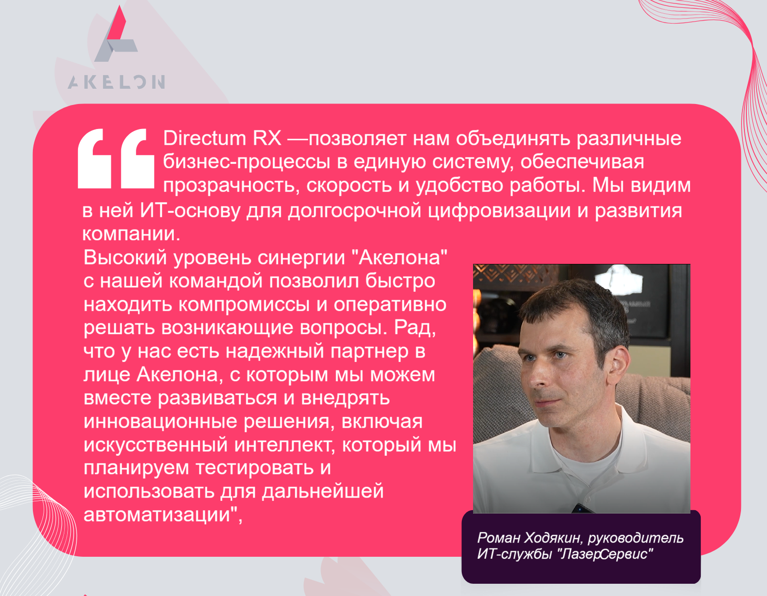 Видеоинтервью Романа Ходякина, начальника отдела управления ИТ "ЛазерCервис" и Романа Панихина, руководителя проекта «Акелон» - это двусторонний кейс-взгляд на переход компании в новую систему. В кейсе подняли вопросы обоснования внедрения для руководителей, рассказали с чем бизнес должен выходить на старт проекта, как избежать увеличения его сроков и стоимости, почему проще внести изменения в процесс, чем в систему, как создать систему под руководителей и владельца бизнеса, что делать с сопротивлением сотрудников. И вообще: как построить работу ИТ-компании и заказчика проекта так, чтобы комфортно и выгодно было всем.