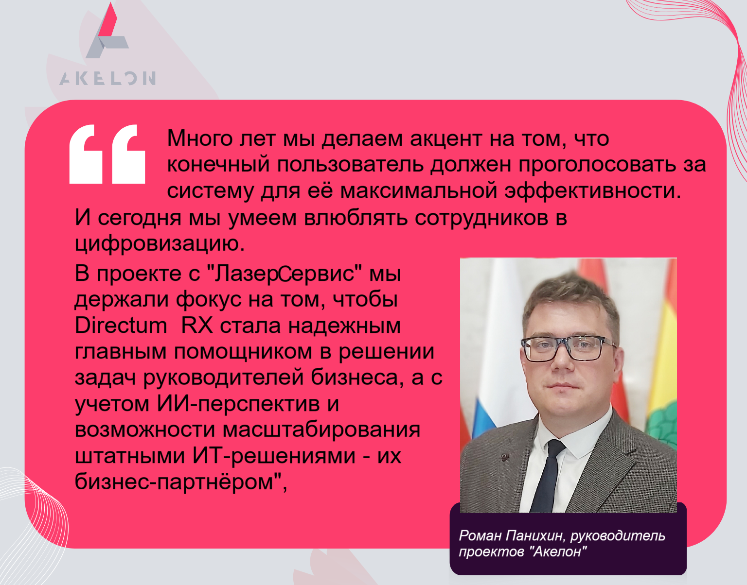 Акелон — российский IT-интегратор, генеральный партнер Directum. На протяжении 16 лет компания оптимизирует и автоматизирует бизнес-процессы Заказчиков из разных отраслей экономики: правительственных и банковских структур, ритейла, компаний нефтегазового, металлургического, машиностроительного и энергетического секторов, фармацевтических, сельскохозяйственных предприятий.
