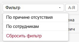 Дополнительно для более удобной работы с информацией была реализована фильтрация списков по причине отсутствия и сотрудникам. Вызывается из выпадающего списка «Фильтр», при активации любого из фильтров дополнительно к двум основным разделам появляется действие «Сбросить фильтр», которое возвращает вид по умолчанию.