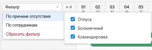 Фильтрация «По причине отсутствия» отвечает за отображения основных причин отсутствия: Отпуск, Больничный и Командировка. По умолчанию все причины активны, можно отфильтровать список по интересующему типу отсутствия.