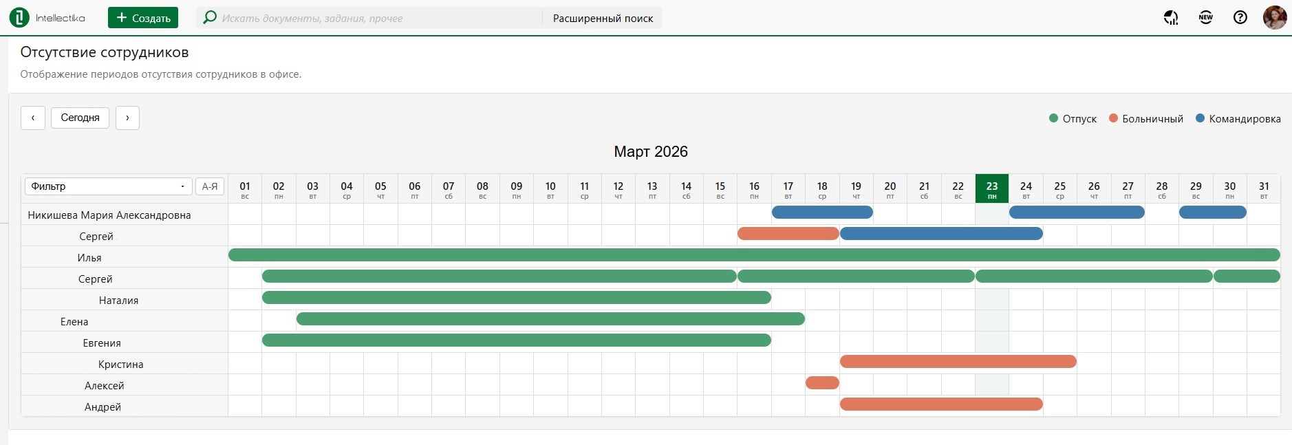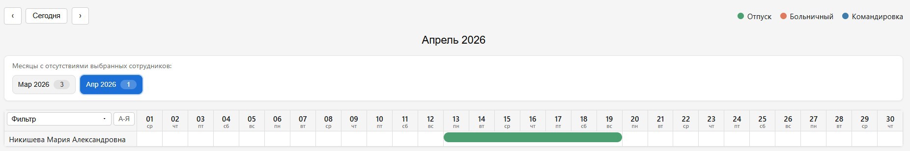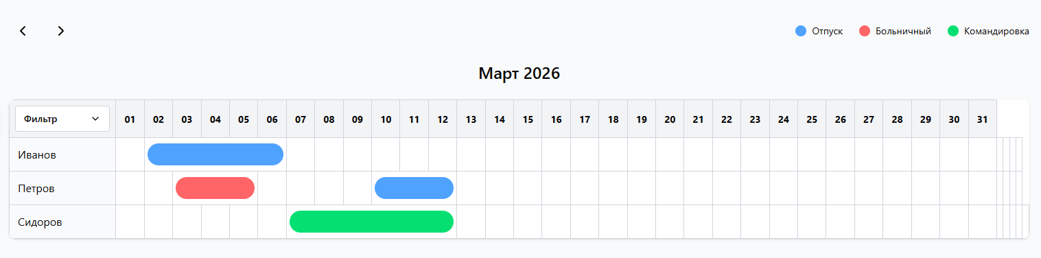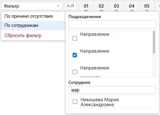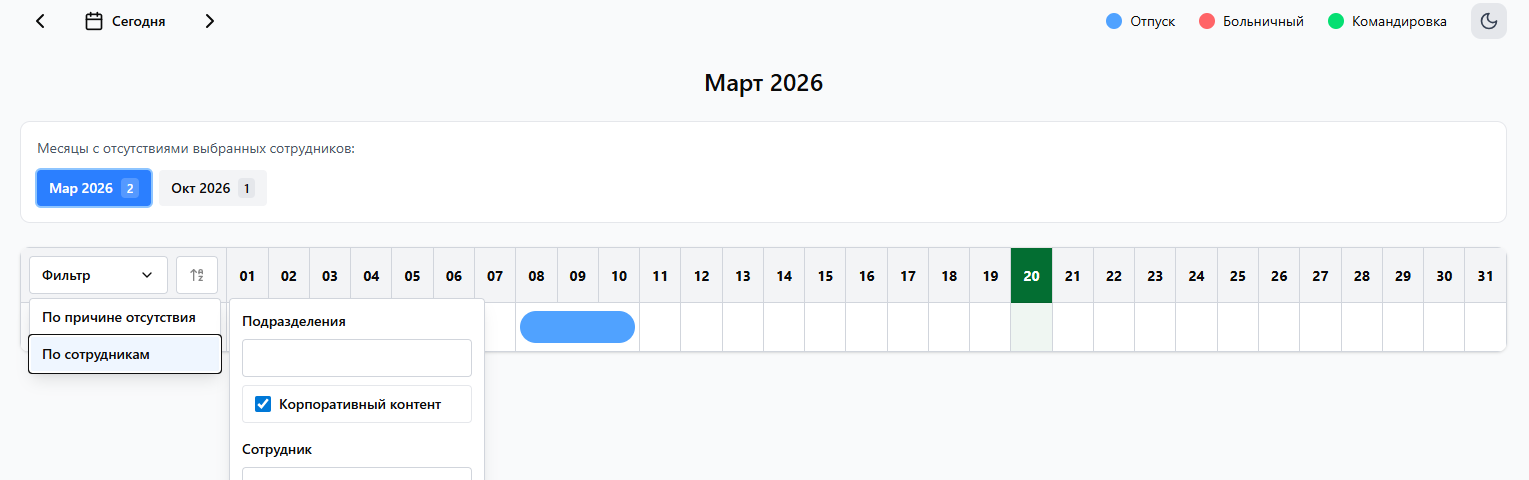 Фильтрация поддерживает множественный выбор сотрудников и подразделений. При выборе и сотрудников, и подразделений они учитываются совместно по логике «ИЛИ»: в календарь попадают сотрудники, которые относятся к выбранным подразделениям, или явно выбраны пользователем. Такой подход обеспечивает корректное отображение всех интервалов отсутствий и избавляет от необходимости строго соотносить сотрудников с подразделениями.