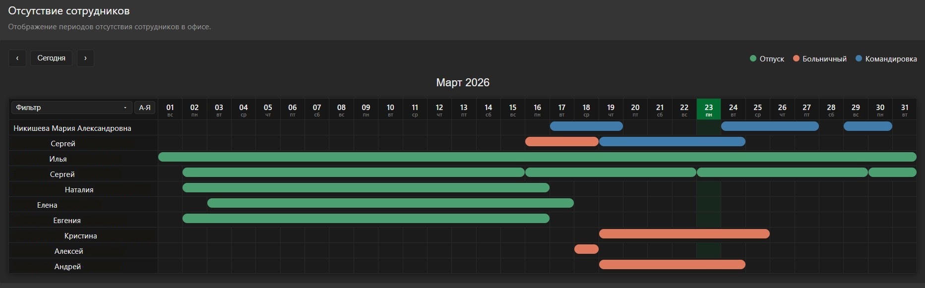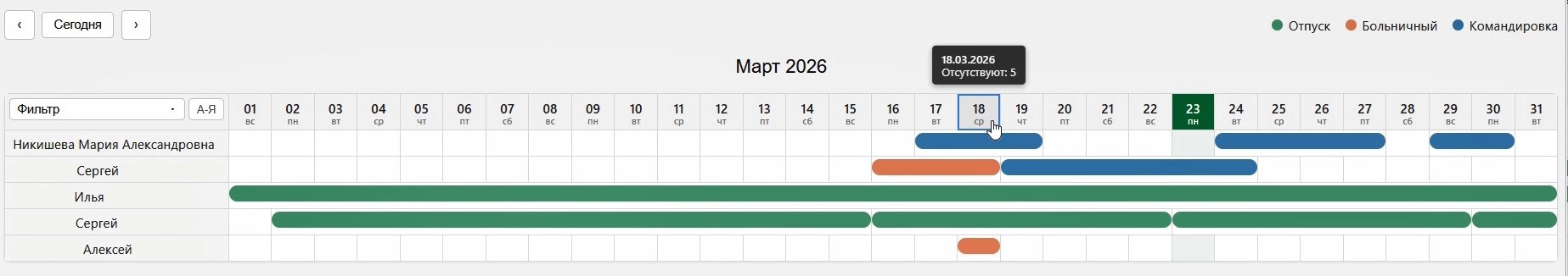 Интерфейс календаря отсутствий – это таблица с легендой, панелью фильтров, сортировкой и навигацией по месяцам, позволяющая быстро просматривать информацию об отсутствующих сотрудниках. Текущий день выделяется цветом в нашем корпоративном стиле.