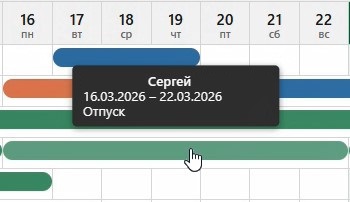 При наведении курсора на интервал внутри календаря появляется подсказка, в которой хранится информация о ФИО сотрудника, периоде и причине отсутствия.