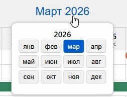При нажатии на заголовок таблицы (месяц, год) открывается всплывающее окно для быстрого перехода к нужному месяцу.