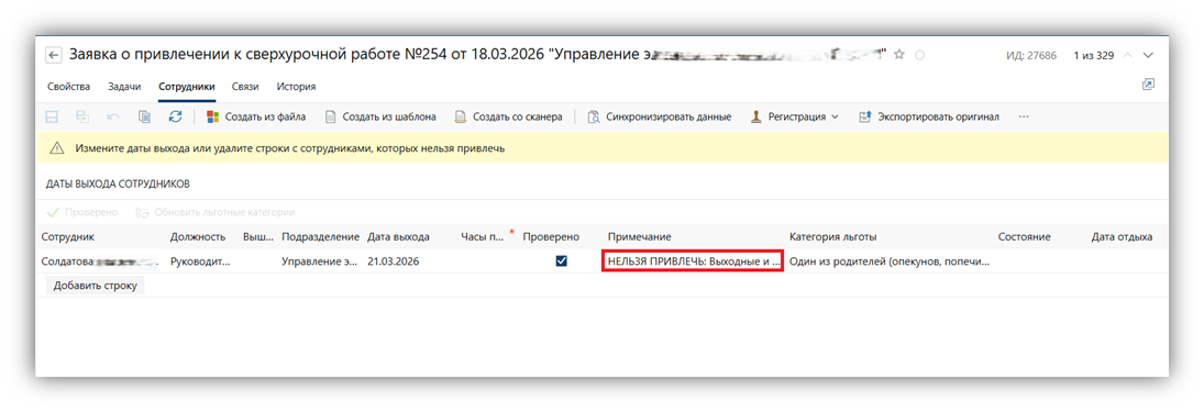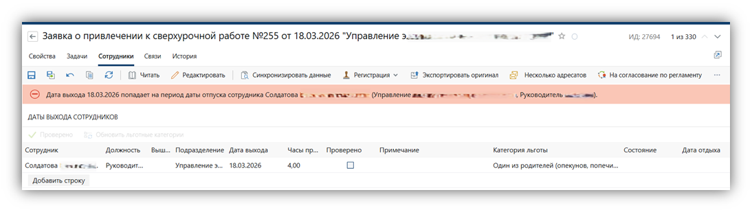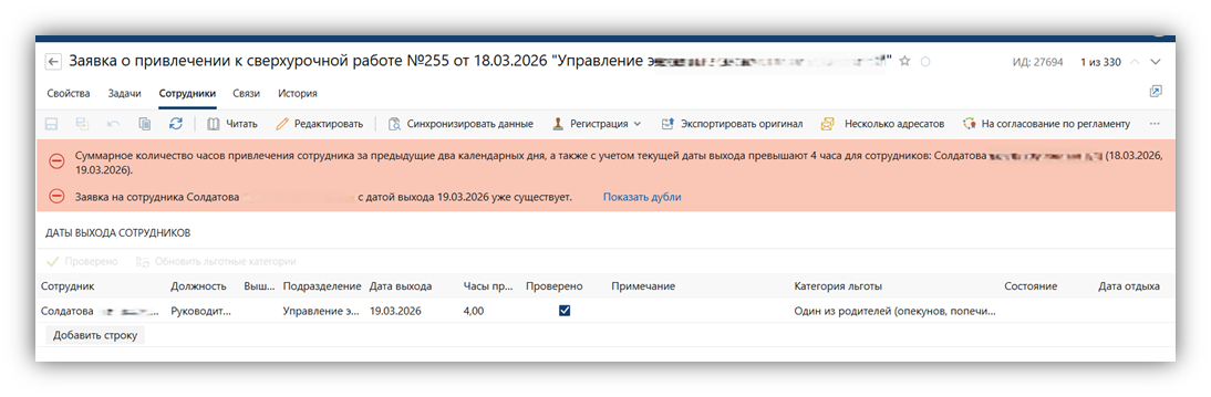 При сохранении заявки производятся следующие проверки по сотруднику: