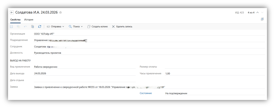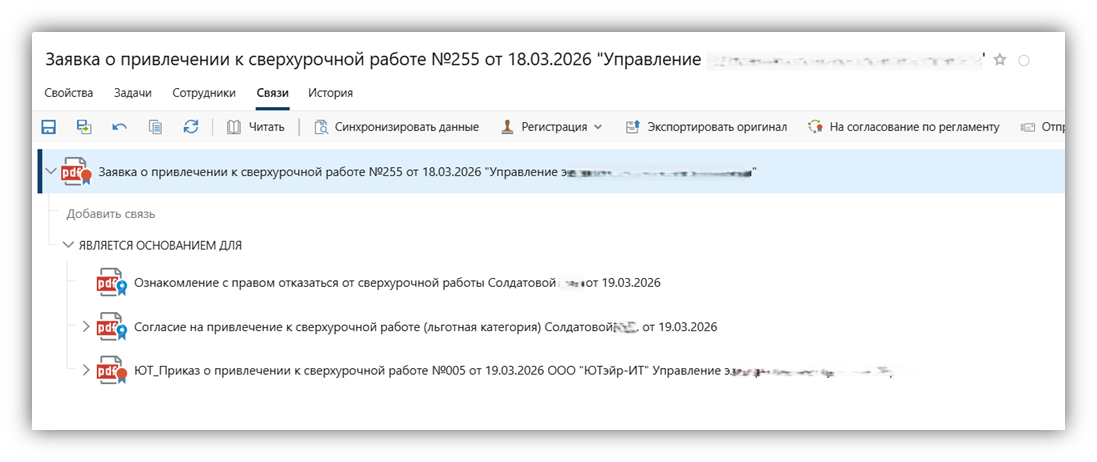 Специалист УДО направляет на ознакомление приказ на привлечение к сверхурочной работе указанным в списке рассылки специалистам. |