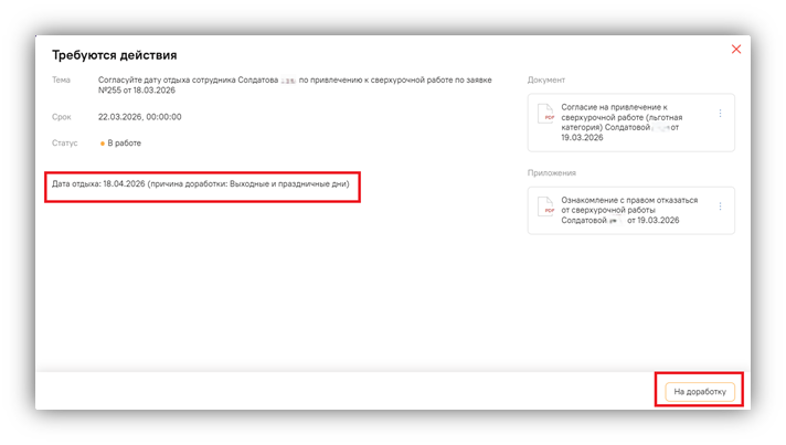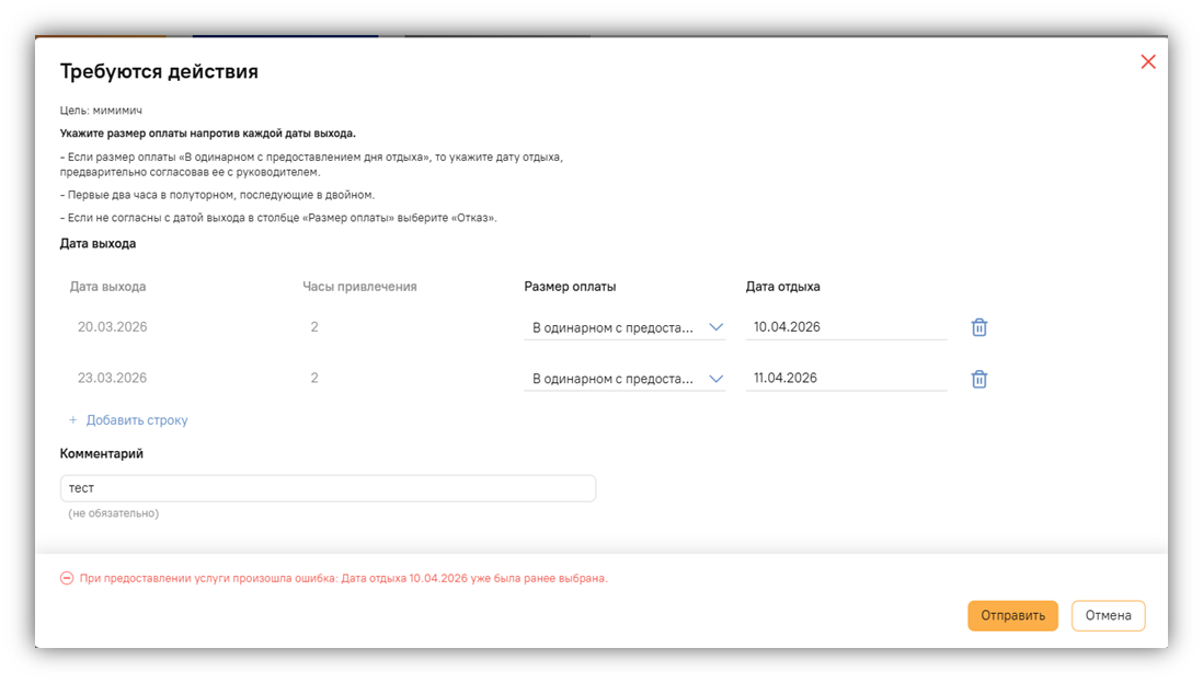 o Дата отдыха не должна попадать в период запланированного/подтвержденного отпуска сотрудника