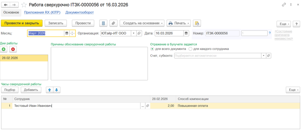 Если данных нет: система создаёт проведённый документ «Работа в выходные и праздники» для всех сотрудников из полученного пакета.