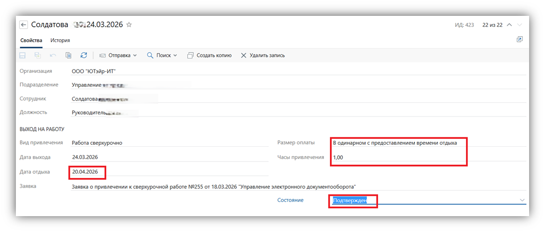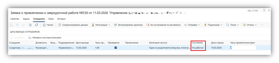 После старта задачи в карточках обрабатываемых записей справочника Работа в выходные дни/сверхурочно изменится состояние с Приказ на Обработан для факта.