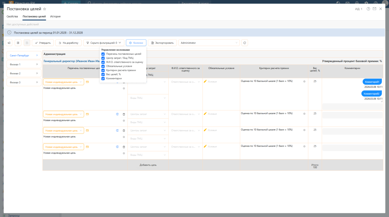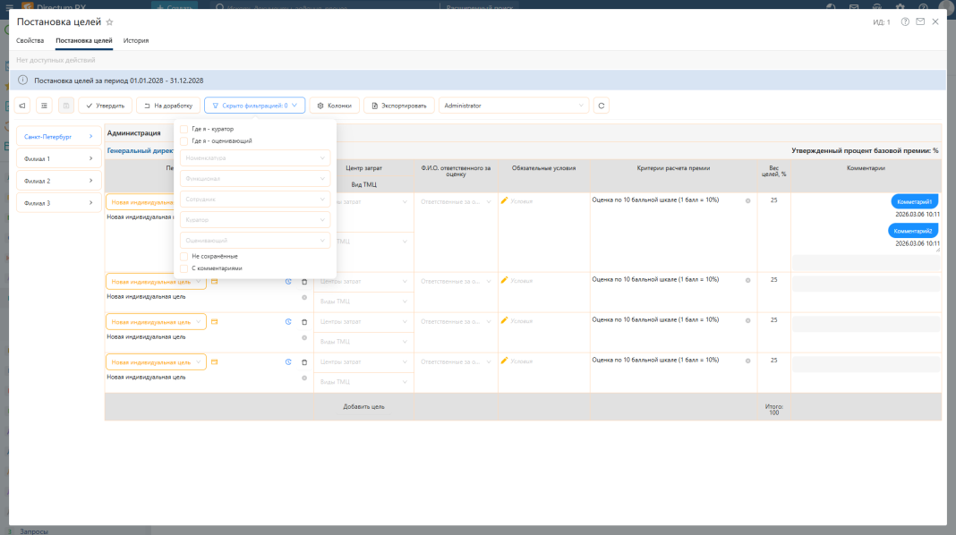 Постановка целей в модуле выстроена по четкой схеме, разделяющей зоны ответственности администраторов, линейных руководителей и топ-менеджмента: