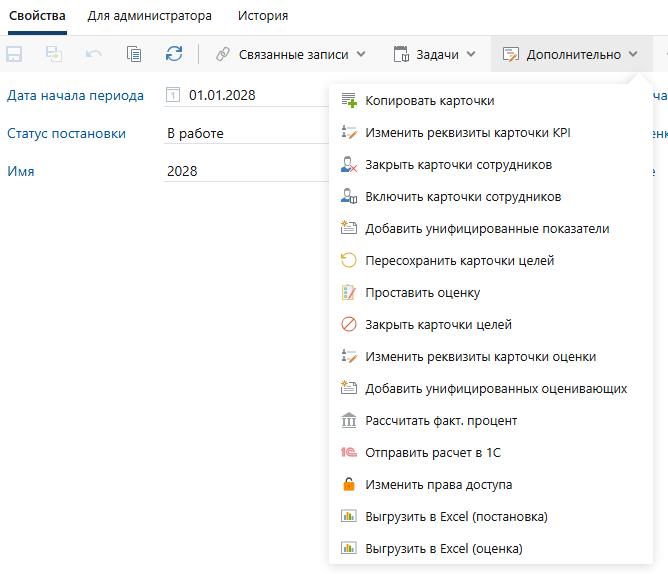 Большинство доступных пользователю действий в модуле регулируется с помощью справочника Права доступа. Каждая запись справочника представляет собой конкретную операцию, которую может выполнить пользователь. Например, возможность создания целей, просмотра карточек, видимость конкретных реквизитов записей, возможность выполнения действий.