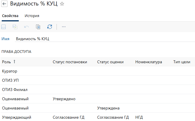 Права доступа назначаются как на определенную КУЦ, так и по должности, региону, организации, функционалу. Из КУЦ, цели, оценки можно посмотреть в какие роли входит пользователь по отношению к текущей записи, а также список пользователей, которым доступно выполнение определенных действий.