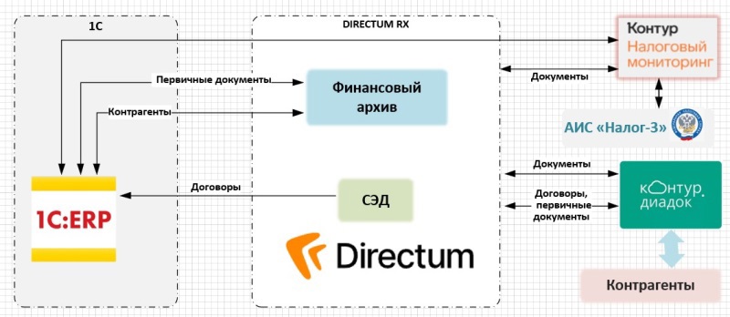 Выбор решения был очевидным — модуль «Финансовый архив» на базе уже внедрённой и успешно работающей системы СЭД Directum RX. На её основе мы развернули взаимодействие с ключевыми системами ИТ-ландшафта предприятия, включая 1С:ERP и Контур.Диадок, чтобы создать единое структурированное хранилище документов. Далее, данные из него передаются для налоговой проверки.